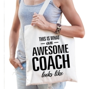 Awesome / geweldige coach kado katoenen tas wit / creme voor dames en heren. Dit witte katoenen tasje is eenzijdig bedrukt met de tekst: This is what an awesome coach looks like. Kent of heeft u…