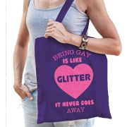 Gay Pride tas/shopper voor dames in de kleur paars en met roze glitter bedrukking. De tas is eenzijdig bedrukt met: Being gay is like glitter, it never goes away. Ideaal om mee te nemen naar de…