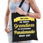 Katoenen cadeau tas voor dames. Geef je favoriete collega het perfecte afscheidscadeau met dehij stijlvolle cadeau tas! De tas in zwart/geel heeft de vrolijke tekst "Dit is hoe de meest Grandioze…