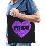 Gay Pride tas/shopper voor heren in de kleur zwart en met paarse glitter bedrukking. De tas is eenzijdig bedrukt met de tekst: Pride, in een groot paars glitter hart. Ideaal om mee te nemen naar…