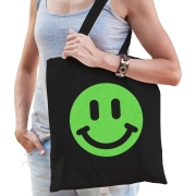 Katoenen cadeau tas voor dames in de kleur zwart. De shopper is eenzijdig bedrukt met: een smiley, in groene glitter. Geef dit leuke tasje cadeau voor Moederdag, haar verjaardag of gewoon zomaar…