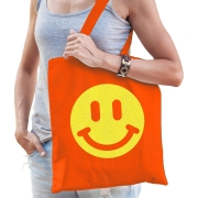 Katoenen cadeau tas voor dames in de kleur oranje. De shopper is eenzijdig bedrukt met: een smiley, in gele glitter. Geef dit leuke tasje cadeau voor Moederdag, haar verjaardag of gewoon zomaar om…