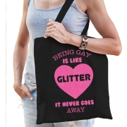 Gay Pride tas/shopper voor dames in de kleur zwart en met roze glitter bedrukking. De tas is eenzijdig bedrukt met: Being gay is like glitter, it never goes away. Ideaal om mee te nemen naar de…