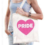 Gay Pride tas/shopper voor dames in de kleur wit en met roze glitter bedrukking. De tas is eenzijdig bedrukt met de tekst: Pride, in een groot roze glitter hart. Ideaal om mee te nemen naar de gay…