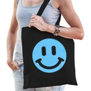 Katoenen cadeau tas voor dames in de kleur zwart. De shopper is eenzijdig bedrukt met: een smiley, in blauwe glitter. Geef dit leuke tasje cadeau voor Moederdag, haar verjaardag of gewoon zomaar…