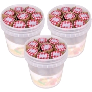 30x Weckpotjes 210 ml in kunststof emmer. De emmer heeft een kunststof beugel en een doorzichtige plastic deksel. Capaciteit van de glazen: ongeveer 212 ml. Voorraadpotjes / weckpotjes / Mason…
