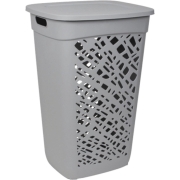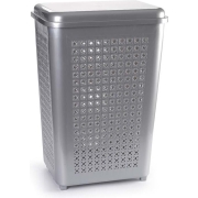 Wasmand met deksel grijs. De lichtgewichte wasbox heeft openingen waardoor de was optimaal kan ventileren en te zien is wanneer de mand vol raakt. Inhoud: 60 liter. Afmetingen ca: L43 x B36 x H63…