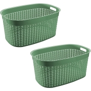 Rotan line wasmand - 2x - groen - inhoud 44 liter - kunststof - 58 x 39 x 27 cm - met handvatten -