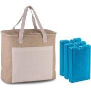 Grote koeltas jute/canvas 20 liter en 38 x 32 x 16 cm met 6x stuks koelelementen blauw -
