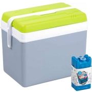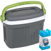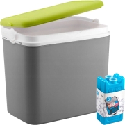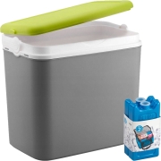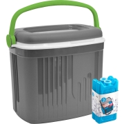 Koelbox in de kleur grijs met 2x koelelementen in de kleur blauw. De koelbox heeft een liter inhoud van 24 liter en het formaat is circa L36 x B27 x H40 cm. Het formaat van een koelelement is…
