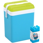 Koelbox in de kleur blauw met 2x koelelementen in de kleur kobalt blauw. De koelbox heeft een liter inhoud van 25 liter en het formaat is circa L39 x B29 x H42 cm. Het formaat van een koelelement…