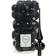 Decoris kerstballen 30x stuks met piek - zwart 4/5/6 cm kunststof mat/glans/glitter mix. Onbreekbare kerstballen met ophanglintjes. De shiny glazen piek is 26 cm. Kerst versiering/decoratie voor…