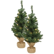 Bellatio Decorations mini kerstboom - 2x - H45 cm - met kerstverlichting - jute zak -
