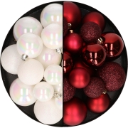 Kerstballen 60x stuks donkerrood/parelmoer wit. Kunststof kerstballen in een mix van 30 stuks in de kleur donkerrood en 30 stuks in de kleur parelmoer wit. Diameter: mix 4-5-6 cm, mat/glans/…