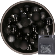 Kerstballen - 48x st - zwart - 6 cm - kunststof - met kerstbalhaakjes zilver -