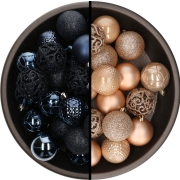 Kunststof kerstballen 74x stuks donkerblauw en lichtbruin 6 cm -