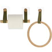Badkamer set toiletrolhouder en handdoekhaak - zelfklevend - cognac - bamboe/kunstleer - zonder bore -