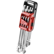 Standaard meegeleverd8-10-11-12-13-14-15-17-19 mmBijzondere kenmerken9-delig set ratelringsteeksleutels, in compacte houder…