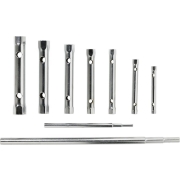 Pijpsleutelsets, metrisch. In kartonnen verpakking. DIN 896-B. Uitvoering: Vernikkeld en verchroomd, fijn gepolijst. Materiaal: chroom-molybdeenInhoud: Elk 1 pijpsleutel 8 x 9 mm, 10 x 11 mm, 12 x 13…
