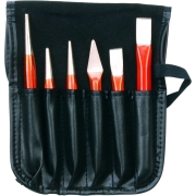Beitelset Met Centerpunt en Doorslag- Set, 6-delig in kunststof tas- Uitvoering: Vernikkeld, met veilige slagkop- Materiaal: Hooggelegeerd kwaliteitsstaal, met kunststof bekleed…
