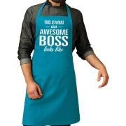 Awesome boss cadeau bbq / keuken schort turquoise blauw voor heren. Op dit turquoise blauwe schort staat groot de tekst: This is what an awesome boss looks like. Leuk kado idee voor bijvoorbeeld…