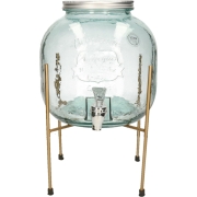 Limonade/drank/water dispenser met een inhoud van 6 liter. Gemaakt van transparant glas en staat op een goud metalen verhoger. De drankdispenser is voorzien van een metalen kraantje en een…