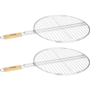 2x BBQ/barbecue vlees/vis/groente grill klem met houten handvat rond 40 cm. vlees/vis/groente grill rooster voor op de barbecue. Formaat: 40 cm (66cm inclusief handvat). Materiaal: Metaal/hout.…