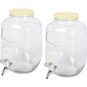 2x stuks drankdispensers/limonadetap 4 liter. Formaat: 15 x 26 x 20,5 cm. Materiaal: glas, metaal, kunststof. De dispenser is gemakkelijk te openen en sluiten middels de grote geel/wit geblokte…