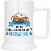 Geslaagd Cadeau bierpul. Deze stoere bierpul is bedrukt met de tekst: Proost op de aller leukste en beste GESLAAGDE. Is er iemand in jou omgeving geslaagd, geef dan deze stoere bierpul…