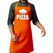 Chef pizza schort / keukenschort oranje voor heren. Dit schort is bedrukt met de tekst: Chef pizza. Met koksmuts erboven. Ken jij iemand die de beste pizza's maakt? Dan is dit schort een leuk…