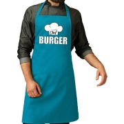 Chef burger schort / keukenschort turquoise voor heren. Dit schort is bedrukt met de tekst: Chef burger. Met koksmuts erboven. Ken jij iemand die de beste burgers maakt? Dan is dit schort een leuk…