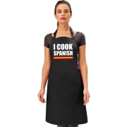 Spaans keukenschort zwart voor volwassenen. Op dit schort staat groot I Cook Spanish, leuk voor iemand die graag Spaans kookt. Materiaal: 65% polyester / 35% katoen. One size: breedte 72 cm,…