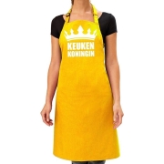 Keuken koningin keukenschort geel voor dames. Dit leuke keukenschort is bedrukt met de tekst: Keuken koningin. Leuk cadeau voor bijvoorbeeld Moederdag. Materiaal: 65% polyester / 35% katoen…
