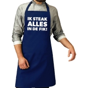 Schort voor heren in de kleur kobalt blauw. Op het schort staat de tekst: Ik steak alles in de fik. Het schort is leuk om cadeau te geven voor bijvoorbeeld Vaderdag. Is je vader of opa binnenkort…