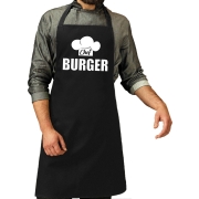 Chef burger schort / keukenschort zwart voor heren. Dit schort is bedrukt met de tekst: Chef burger. Met koksmuts erboven. Ken jij iemand die de beste burgers maakt? Dan is dit schort een leuk…