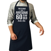 Cadeau schort voor heren in de kleur navy blauw. Op het keukenschort staat de tekst: This is what an awesome 60 year old looks like. Een leuk kado idee voor bijvoorbeeld een verjaardag of een…
