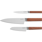De set bestaat uit : het koksmes met 20-cm lemmet, het vlees-/trancheermes en het officemes. Lemmeten uit één stuk gesmeed roestvrij staal. Heften van ongevernist beukenhout uit ecologisch beheerd…