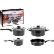 Deze 7 delige anti aanbak set bestaat uit 2 steelpannen (18 en 16 cm), een koekenpan/hapjespan van 22 cm en een kookpan van 22 cm, waarvan de deksel ook op de hapjespan past. Materiaal: gecoat…