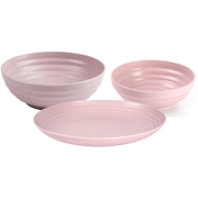 Plasticforte camping borden set in de kleur roze, gemaakt van stevig kunststof. Deze set bevat 2 soorten borden en kommetjes; 6x platte borden D25 cm, 6x diepe borden D19 cm en 6x schaaltjes/…