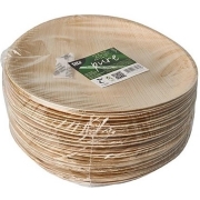 Een set met 75 duurzame, gerecyclede wegwerp bordjes. Afmeting: ca. D25 x H2 cm. Materiaal: palmblad. De bordjes zijn geschikt voor alle soorten voedsel en meerdere malen te gebruiken bij droog…