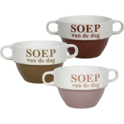 Soepkommen met oor, Soep van de dag, set van 6x stuks, gemaakt van stevig geglazuurd keramiek, met tekst. Afmetingen D12 x H8 cm. In een multi kleuren mix. Stapelbare soepkommetjes/…