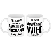 Awesome husband and wife cadeau mok / beker wit, 330 ml. Deze mok/ beker is bedrukt met de tekst: This is what an awesome husband/wife looks like. Deze twee mokken zijn leuk om te geven als cadeau…