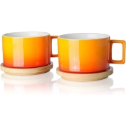 Porseleinen cappuccino kop met houten schotel, 310ml Demitasse kopjes set voor koffie, cappuccino, latte, expresso, americano, thee (tropisch oranje)