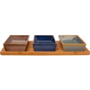 Serveerplank van bamboe van 31 x 15 cm met 1x luxe hapjes/saus/tapas schaaltjes. De gekleurde schaaltjes zijn ongeveer 13 cm lang, 8 cm breed en 5 cm hoog en gemaakt van keramiek. Serveer uw…