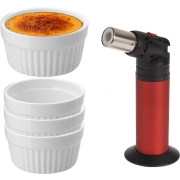 5-Delige creme brulee set met witte schaaltjes en een rode brander. De set bestaat uit 4 witte creme brulee schaaltjes en een handige brander voor het karamelliseren van de suiker. De brander is…