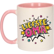 Liefste oma cadeau mok / beker met sterren in pop art. Deze koffiemok / theebeker heeft een roze oor en is aan de binnenkant roze. De buitenkant is wit en bedrukt met de tekst: Liefste oma. Deze mok…