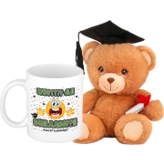 Leuke Geslaagd cadeau mok met knuffel beer. Mok in kleur wit met een veraste smiley en de tekst: Whutt jij geslaagd? Geef deze unieke mok cadeau bij bijvoorbeeld het afstuderen of bij het behalen…