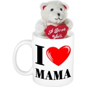 Moederdag cadeau I Love Mama beker / mok 300 ml met beige knuffelbeertje met love hartje -