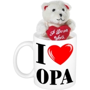 Opa cadeau I Love Opa beker / mok 300 ml met beige knuffelbeertje met love hartje -