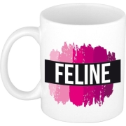 Feline naam cadeau mok / beker met roze verfstrepen - Cadeau collega/ moederdag/ verjaardag of als persoonlijke mok werknemers